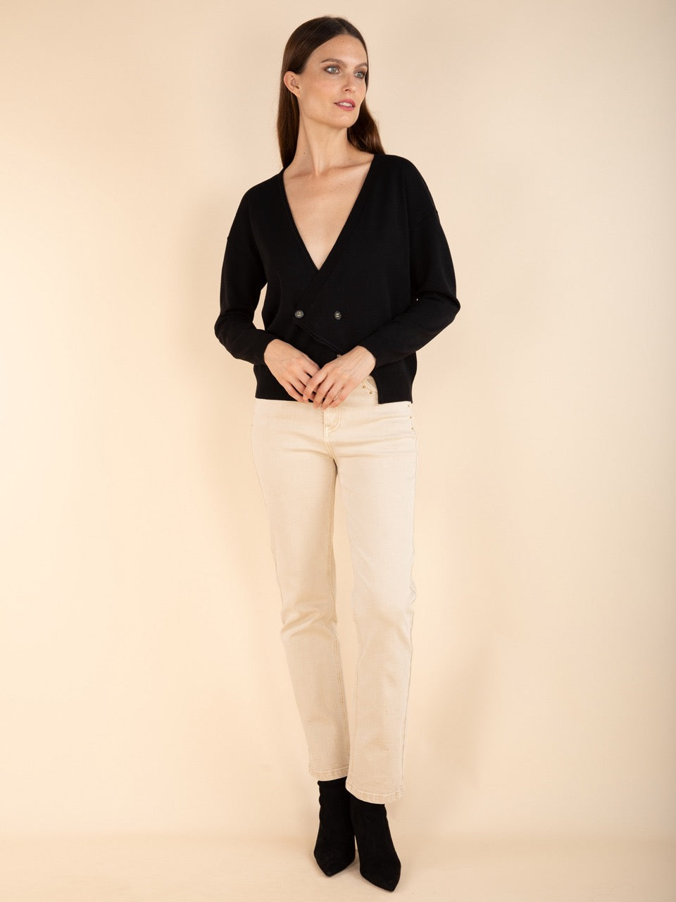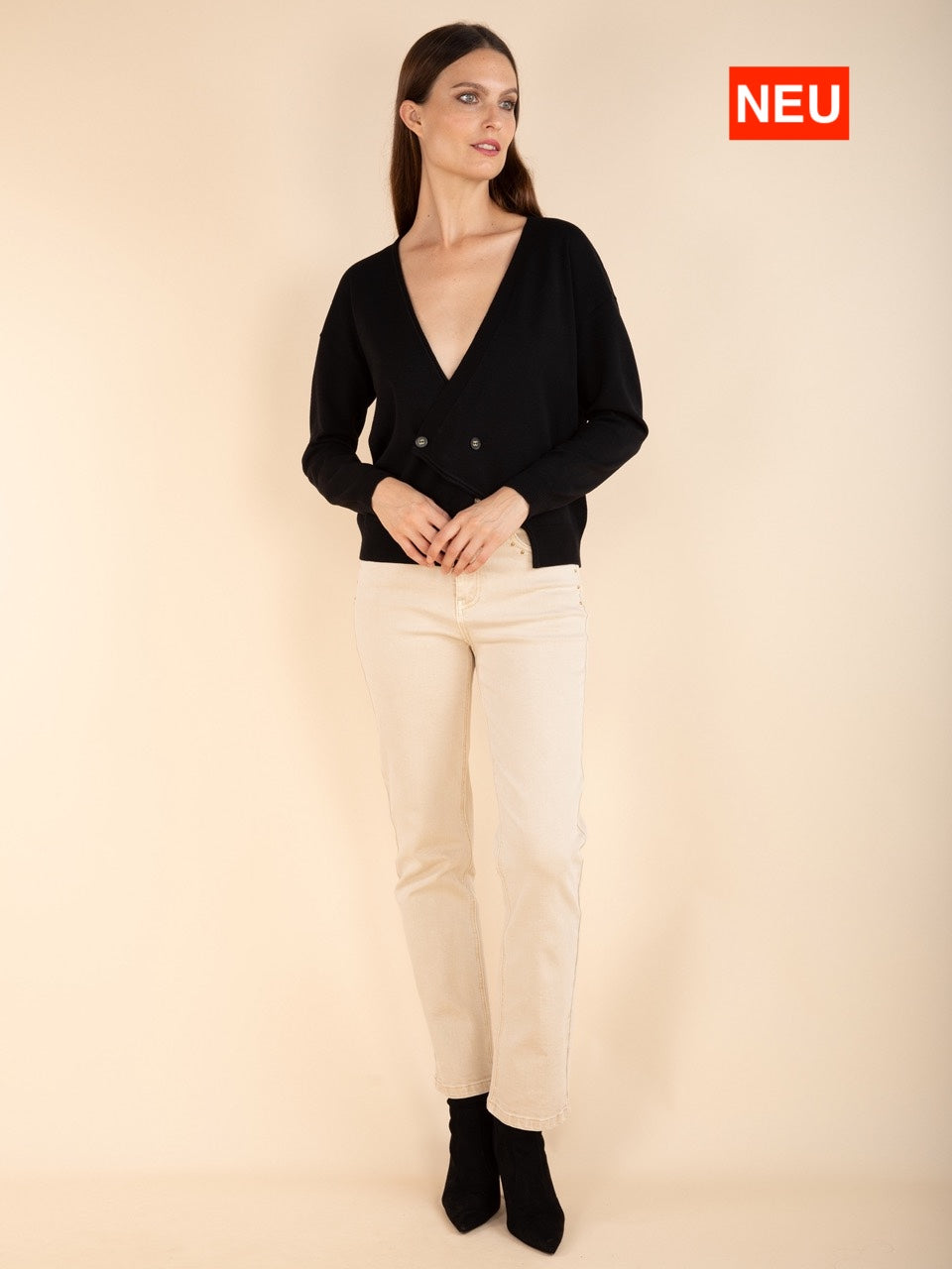 Verlieben Sie sich in diese zweireihige zweireihige Strickjacke, die Eleganz und Komfort in einem modernen und femininen Stil vereint.