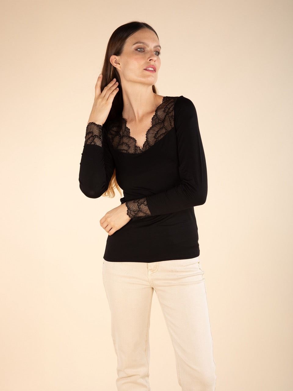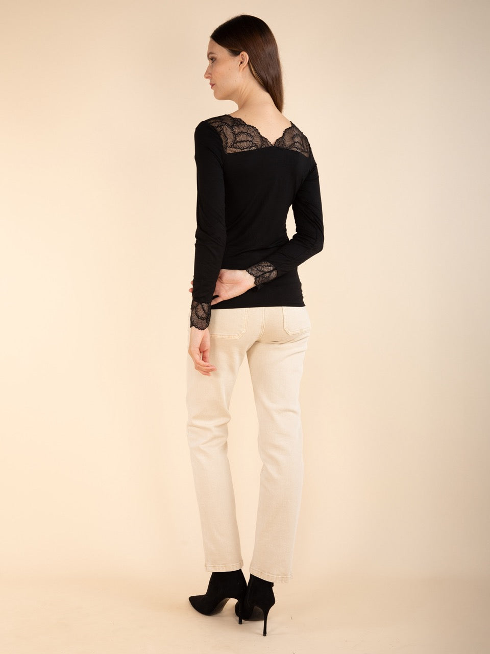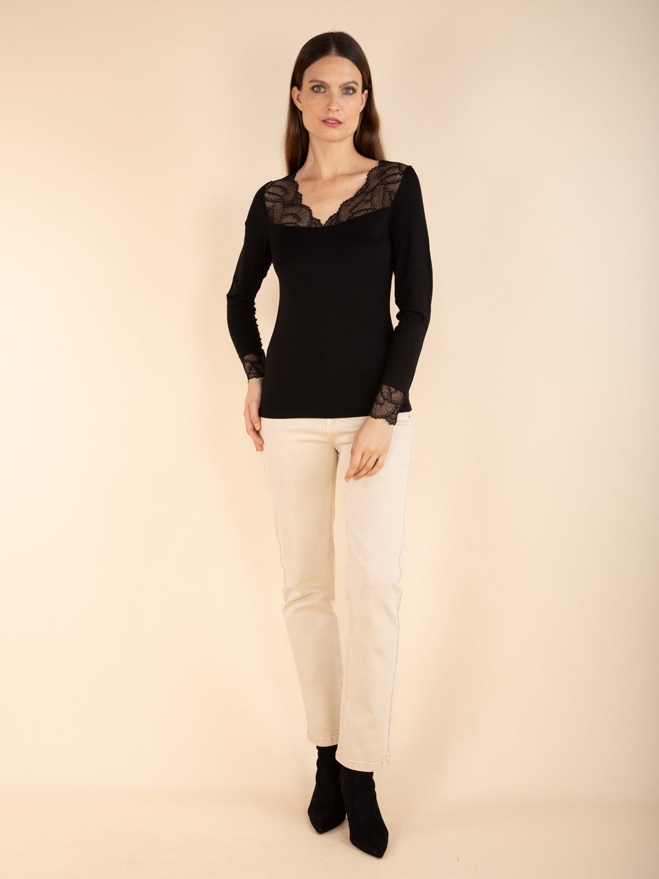 Verlieben Sie sich in dieses gestrickte Oberteil mit V-Ausschnitt, das durch seine Spitzeneinsätze und den taillierten Schnitt für einen femininen und raffinierten Look aufgewertet wird.