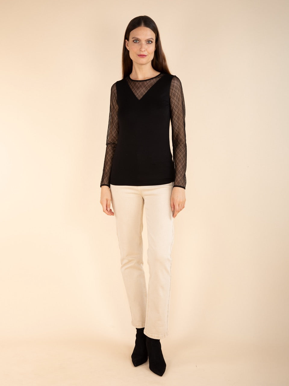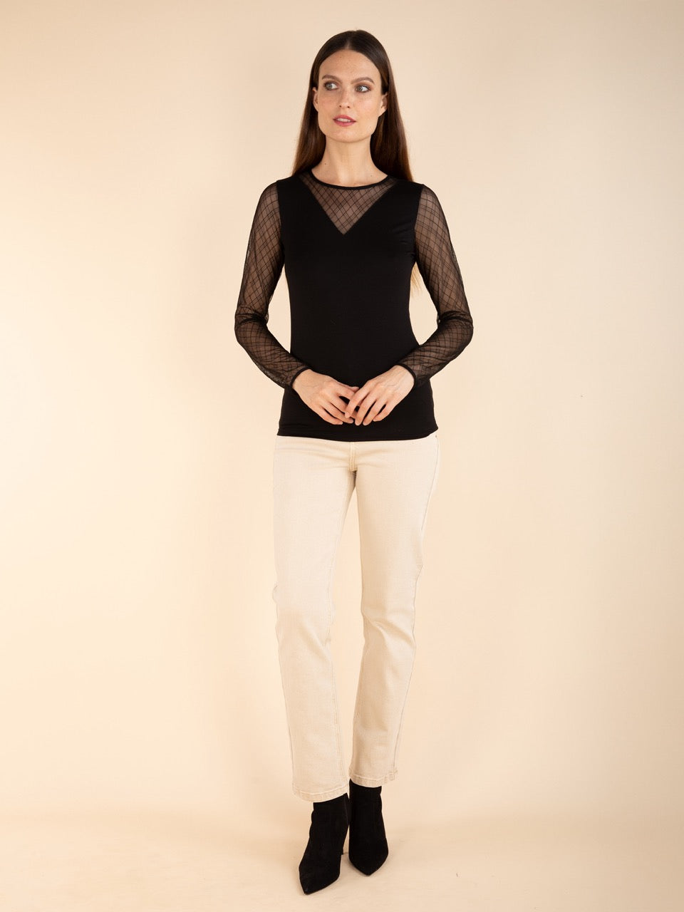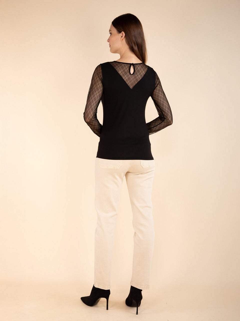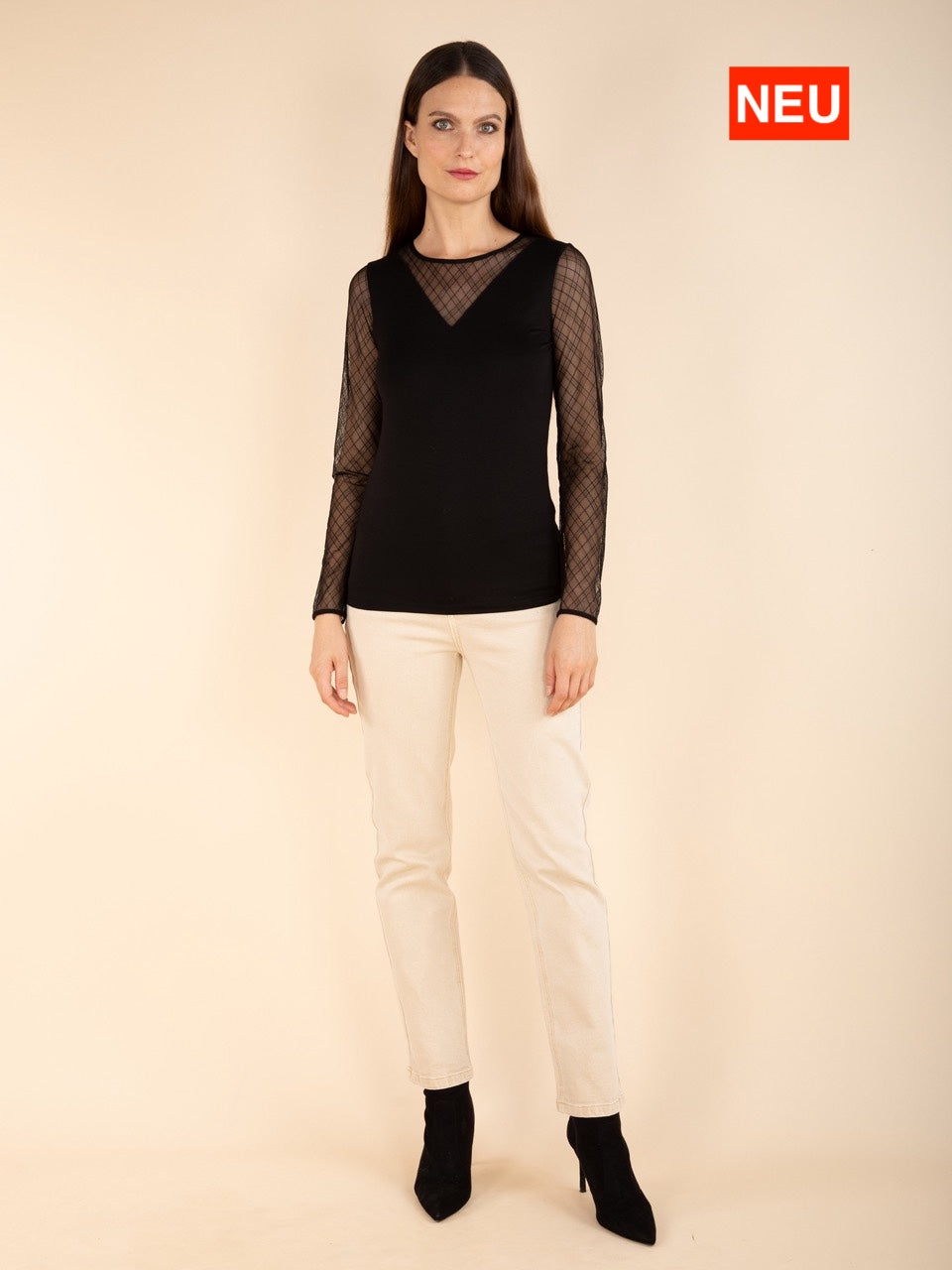 Verlieben Sie sich in dieses langärmelige Oberteil aus ausgefallenem Tüll mit tailliertem Schnitt und zarten Details für einen eleganten und femininen Look.