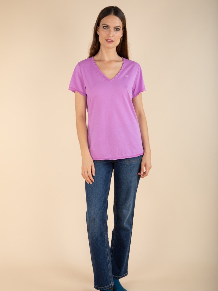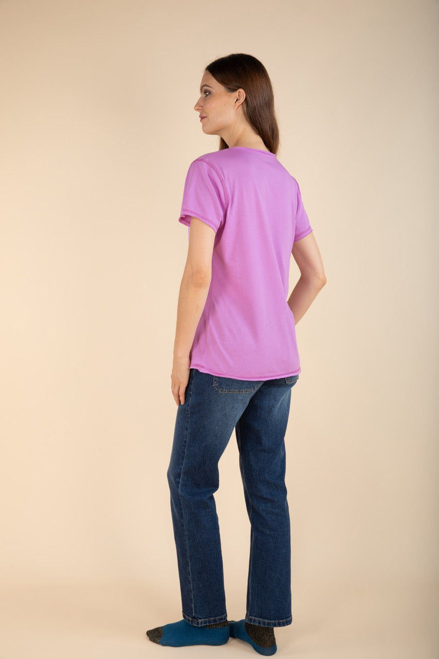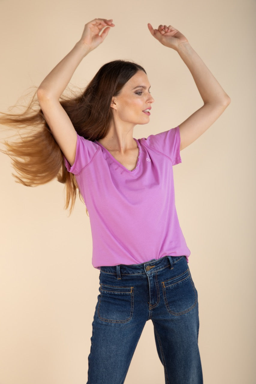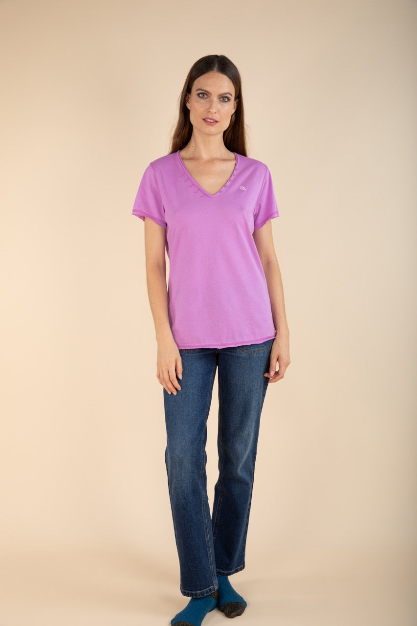Ein Basic, das keines ist. Gerader Schnitt, dezenter Tunisian-Ausschnitt, weicher Jersey, der sanft über die Haut gleitet. Der elektrisierende Touch: ein gebleichtes Violett, fast fluoreszierend, leuchtend und süchtig machend. Auf der Brust die charakteristische Stickerei von Maison Captain. Schlicht, aber niemals banal. Das T-Shirt, das man überzieht und das alles verändert.