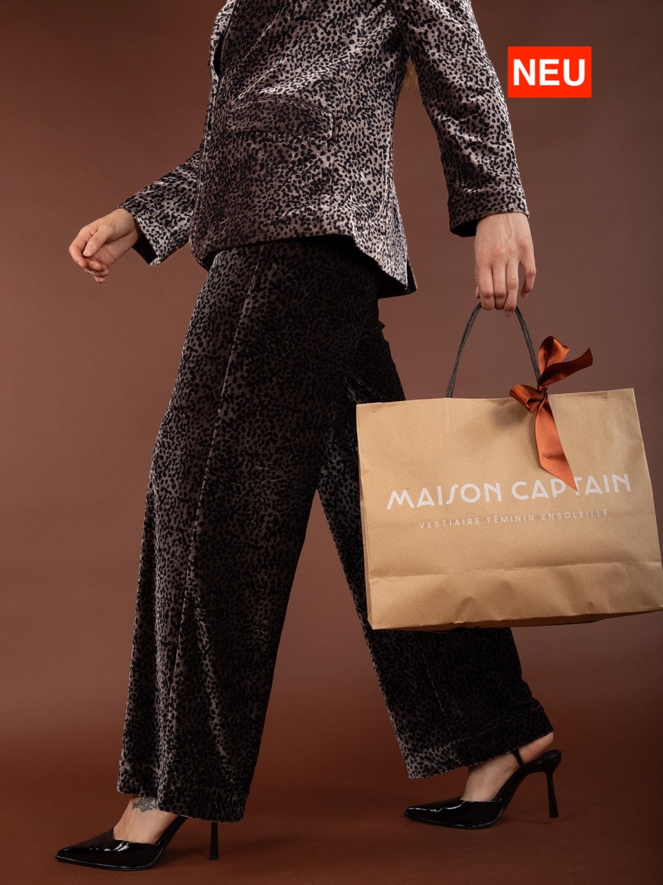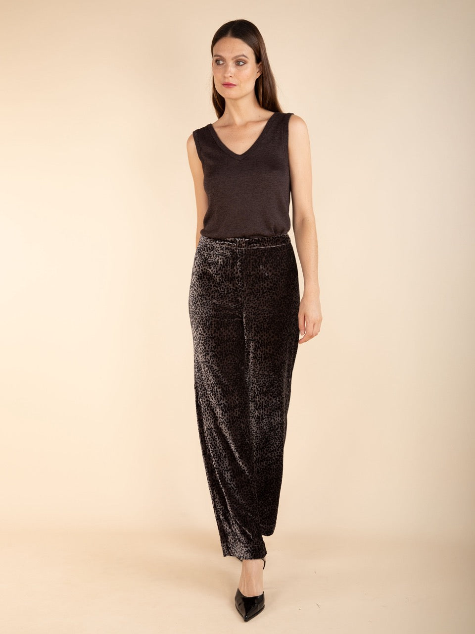 Verlieben Sie sich in diese gerade Hose aus bedrucktem Samt mit tailliertem Schnitt und Metallic-Details für einen schicken und modernen Look.