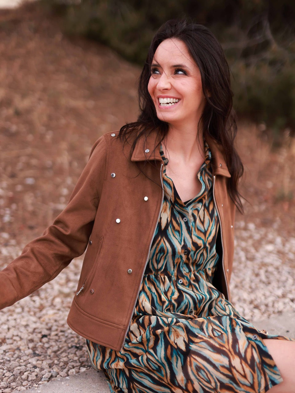 Entscheiden Sie sich für diese Jacke aus Wildlederimitat mit Metallreißverschluss und Nietenverzierungen, die Eleganz und Modernität mit einem makellosen geraden Schnitt verbindet.