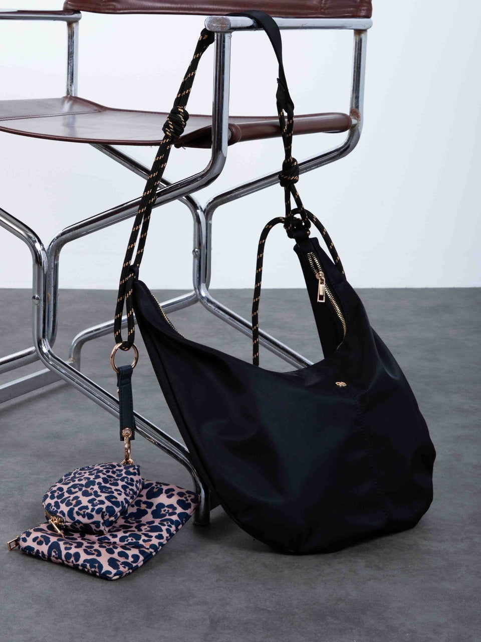 Entscheiden Sie sich für diese große Halbmondtasche aus einfarbigem Nylon, die mit ihrem bedruckten Futter und ihren zahlreichen Taschen Funktionalität und Stil vereint.