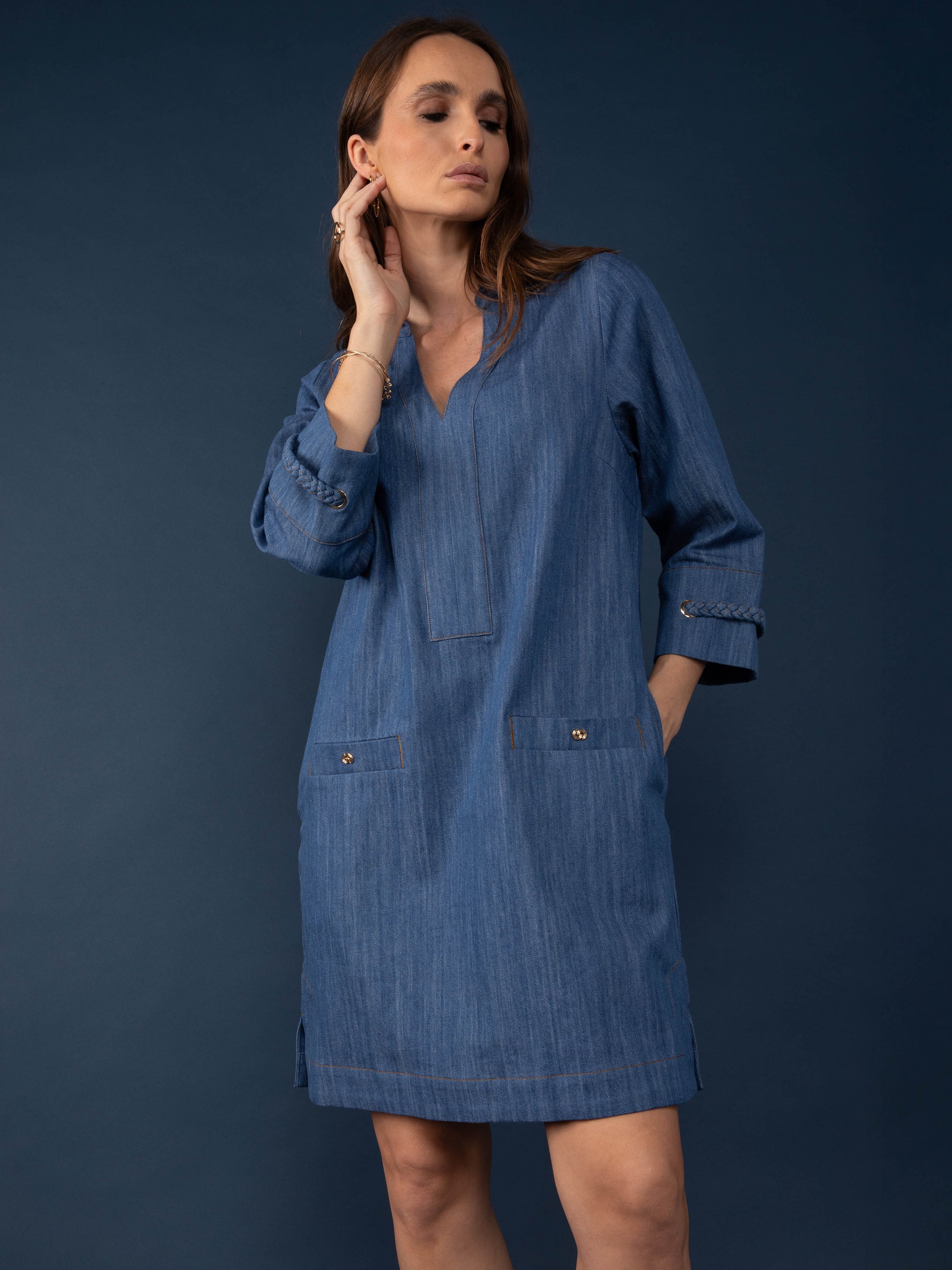 Lassen Sie sich von diesem Denimkleid begeistern, akzentuiert durch kontrastierende Ziernähte und geflochtene Details an den Ärmeln – für einen modernen und schicken Look.