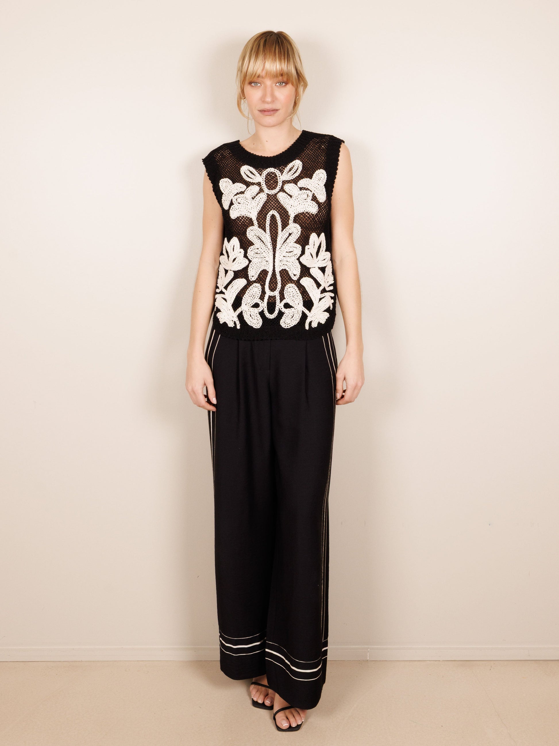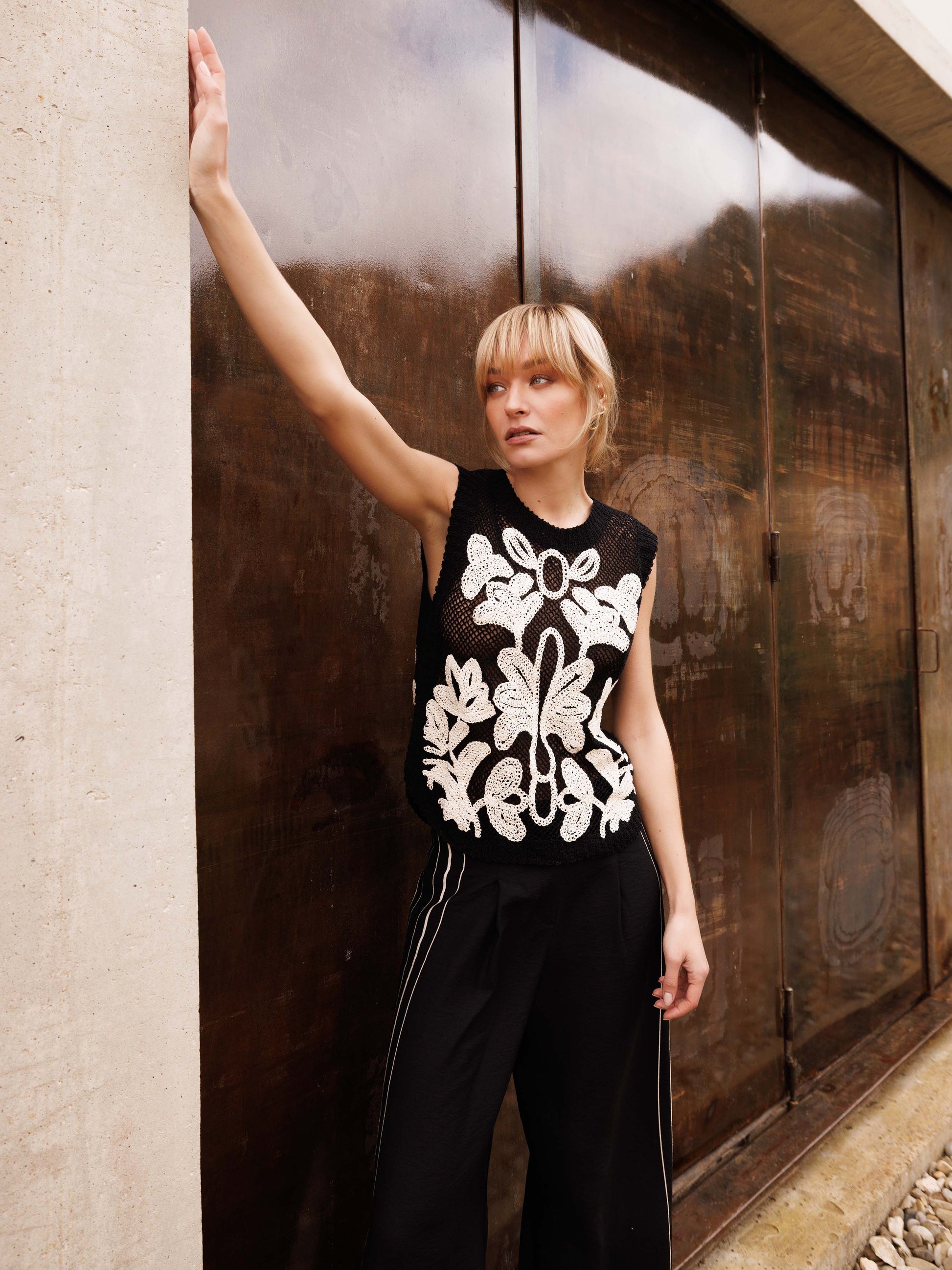 Entscheiden Sie sich für dieses ärmellose Tanktop, das durch seinen Kontrast aus Häkelarbeit und gerippten Bündchen besticht und sich perfekt für einen leichten und eleganten Stil eignet.