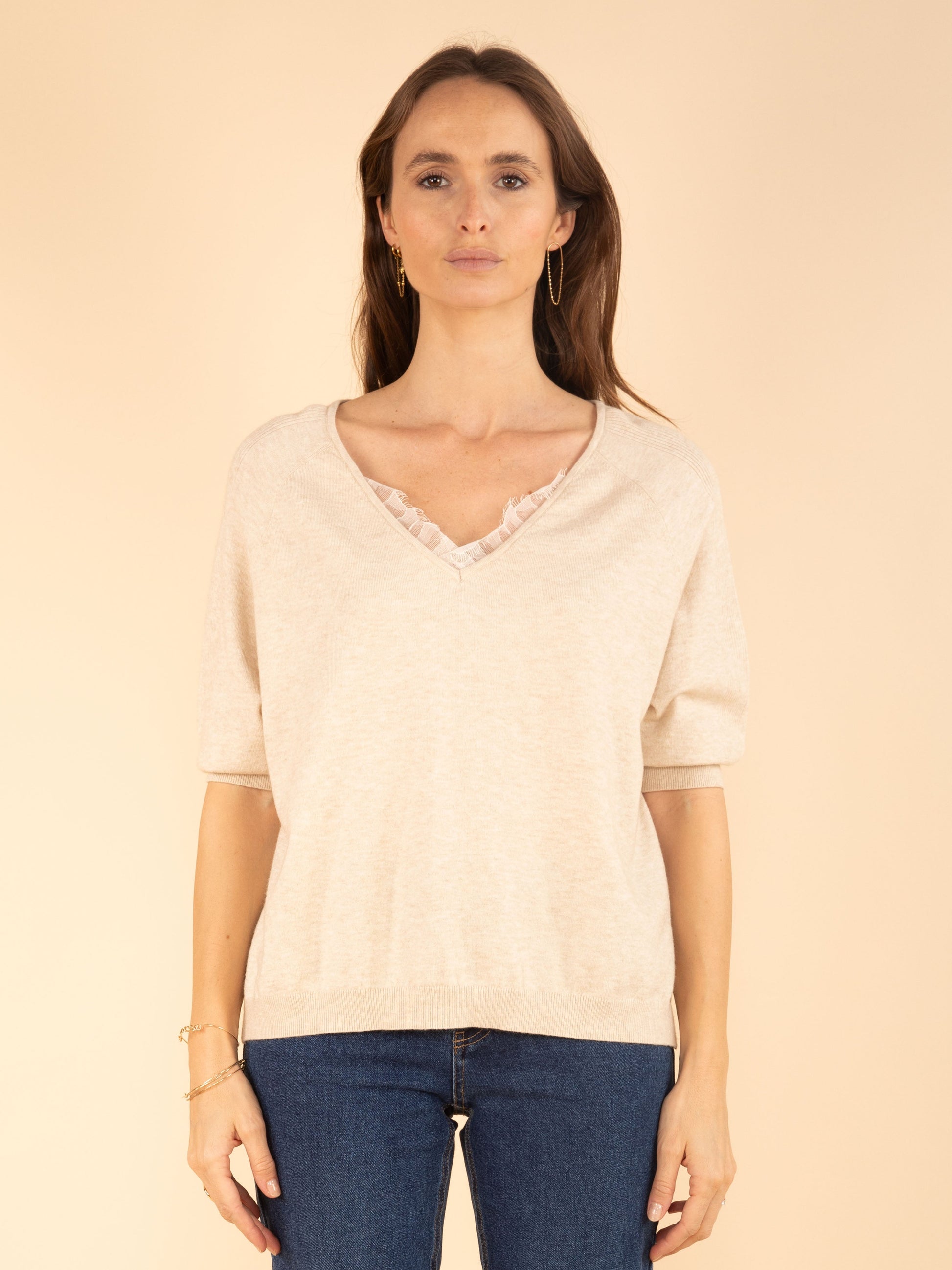 Pullover mit V-Ausschnitt, der durch eine Spitzenverzierung betont wird