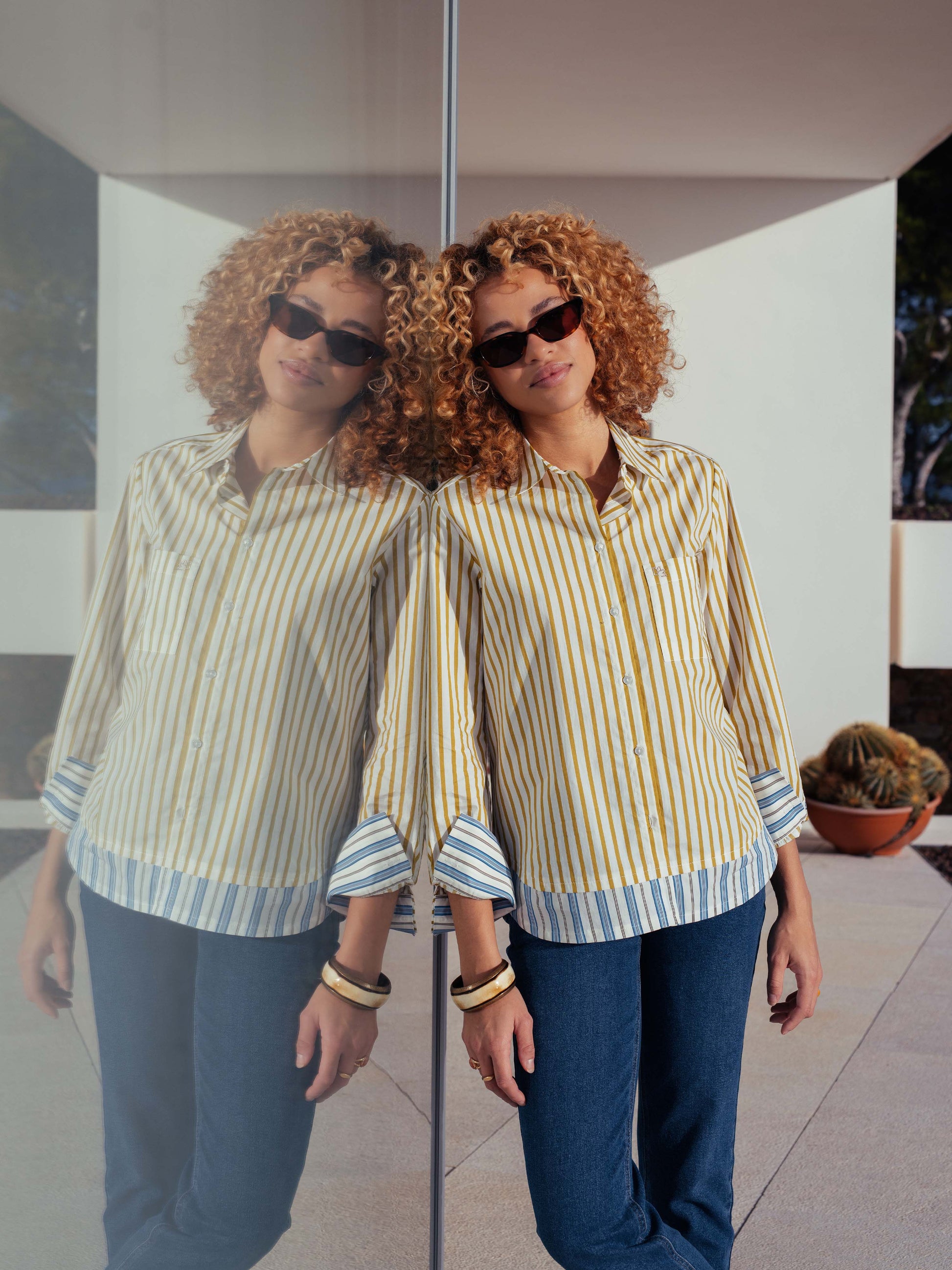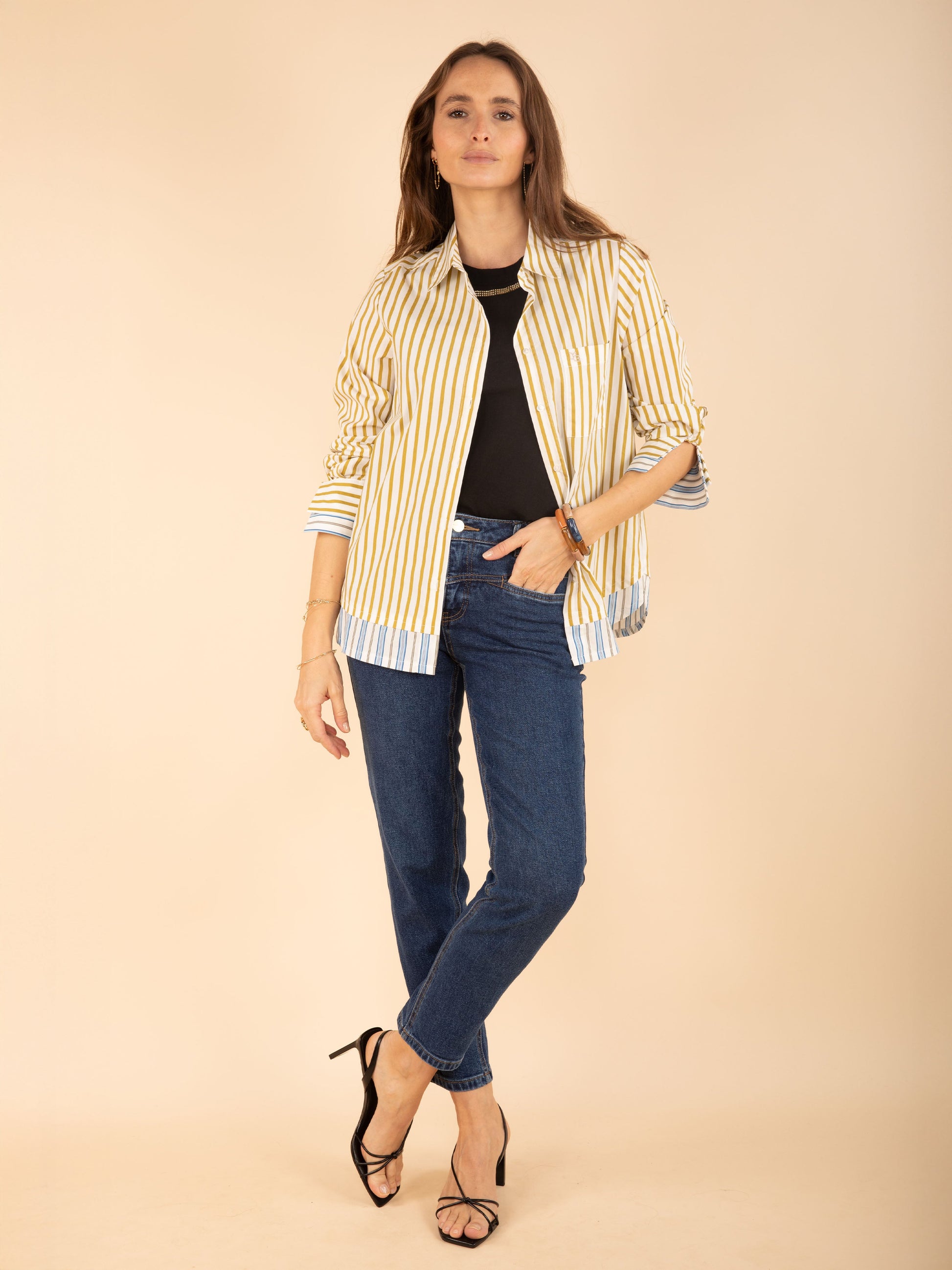 Wählen Sie diese gestreifte Baumwollbluse, die durch ihre bestickte Tasche und ihre runde Falte im Rücken für einen schicken und eleganten Stil sublimiert wird.