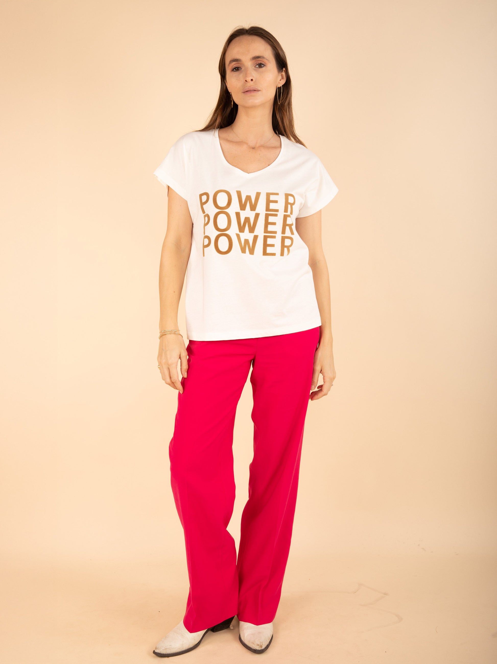 Verfallen Sie für dieses T-Shirt mit V-Ausschnitt und „Power“-Message, das durch seinen Samtdruck und fallende Schultern für einen selbstbewussten und modernen Look sublimiert wird.