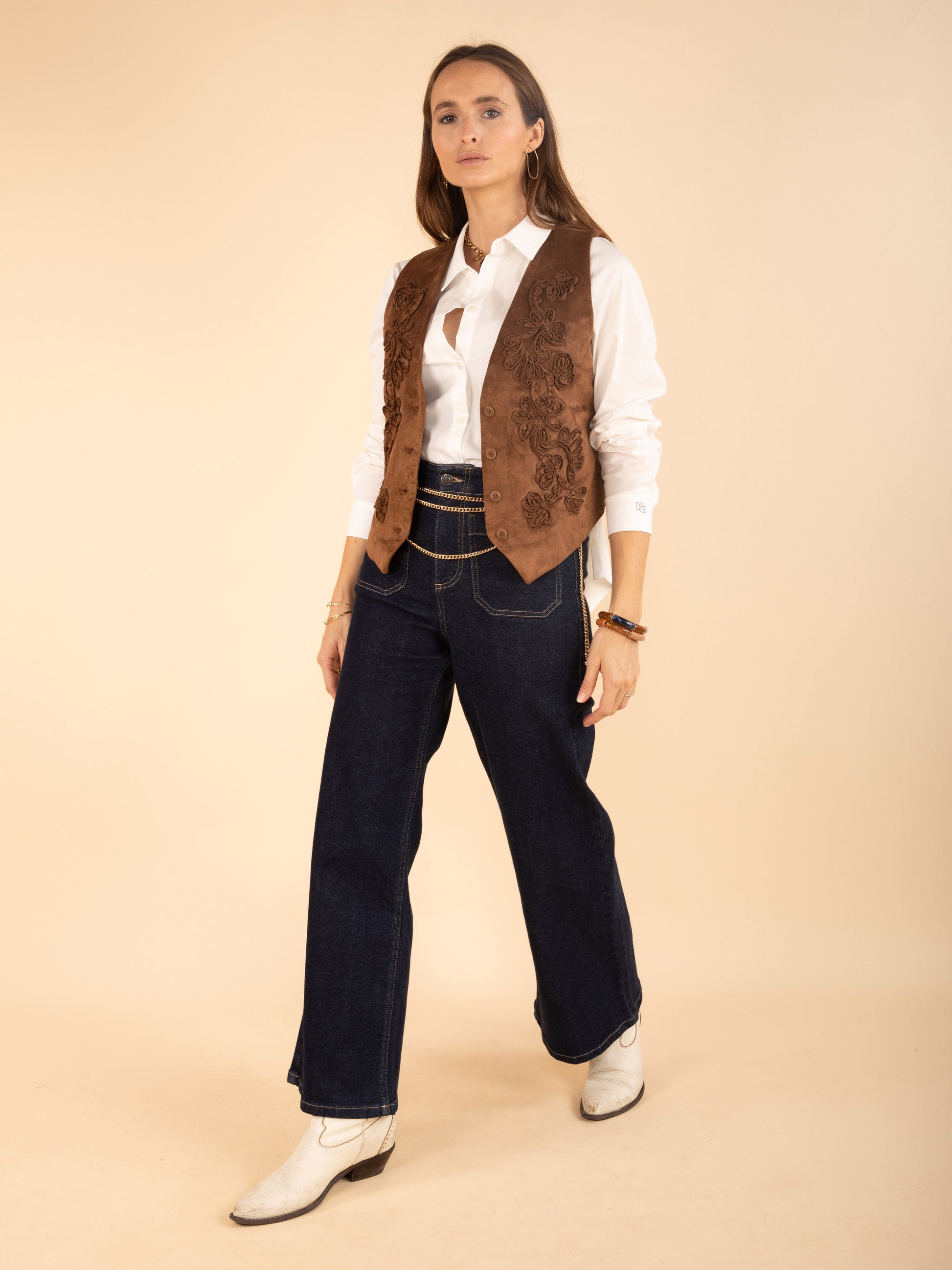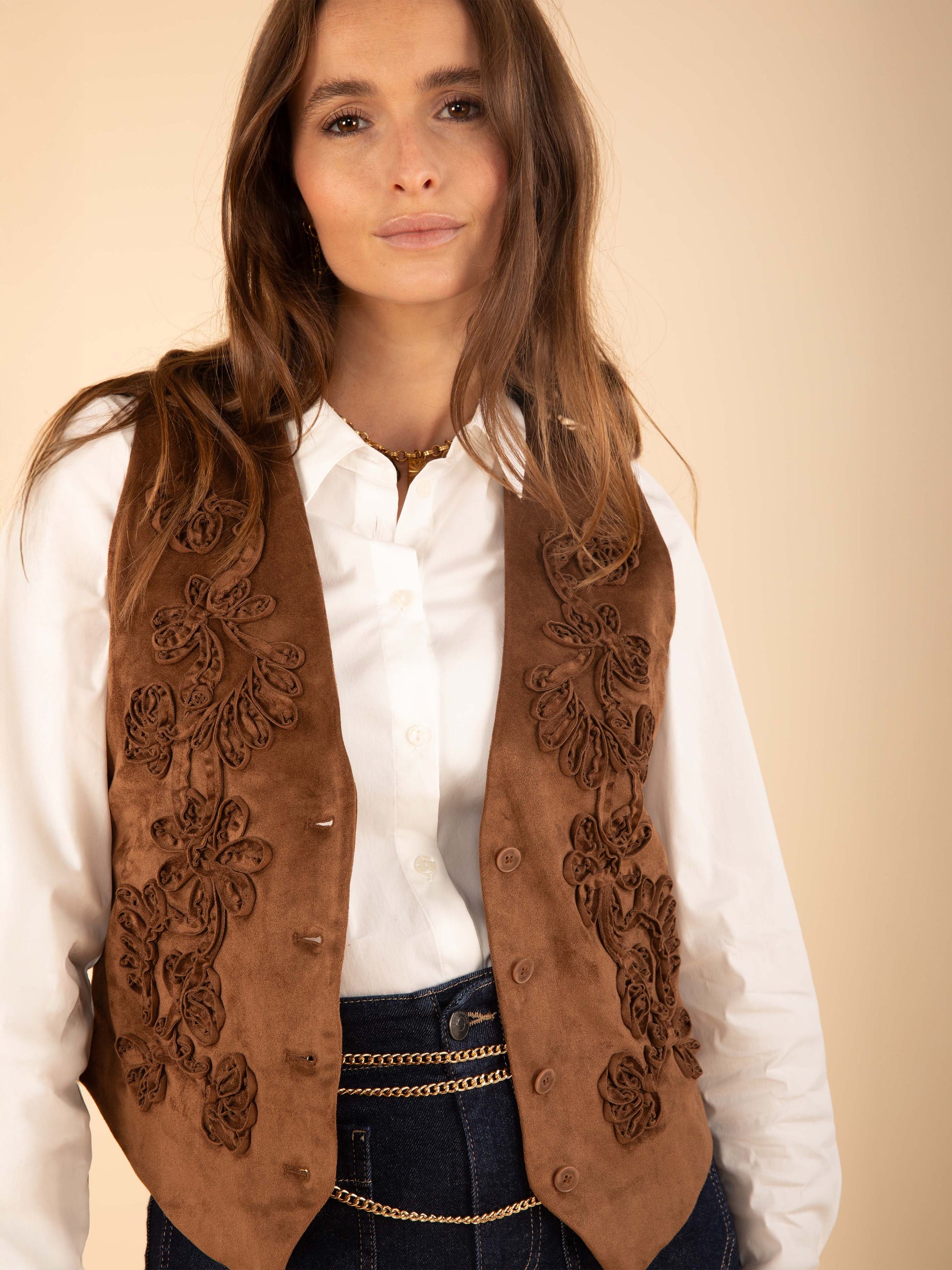 Wählen Sie diese ärmellose Weste gefüttert, die durch ihre fantastische Stickerei und ihren V-Ausschnitt für einen schicken und modernen Stil sublimiert wird.